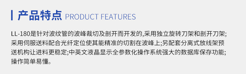 LL-180是針對波紋管的波峰裁切及剖開而開發的,采用獨立旋刀架和剖開刀架;采用伺服送料配合光纖定位使其能精準的切割在波峰上;另配套分離式放線架,預送機構讓進料更穩定;中英文液晶顯示,全參數化操作系統,強大的數據庫保存功能;操作簡單易懂。